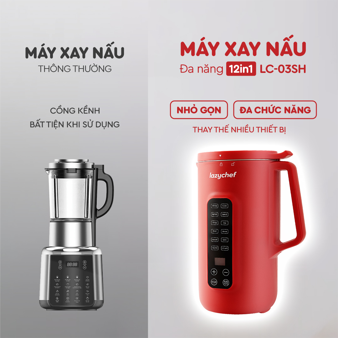 Máy xay nấu đa năng 12in1 Lazychef – CHỐNG TRÀO TUYỆT ĐỐI là sản phẩm gia dụng đa năng – thông minh đến từ thương hiệu Lazychef Việt Nam. Sản phẩm được tích hợp tự động 12 chế độ xay nấu, tự làm sạch và sấy khô để bạn dễ dàng làm sữa hạt, soup, cháo, sinh tố, đồ ăn dặm… cho cả gia đình chỉ với một thao tác đơn giản nhanh và tiện lợi. Máy với dung tích 1000ml, lòng cối xay rộng bề ngang, đầu rót tam giác nhọn chống tràn hiệu giúp công việc nấu nướng của bạn trở nên an toàn hơn bao giờ hết. Máy xay nấu đa năng 12in1 Lazychef là sản phẩm tích hợp nhiều chức năng nhất thị trường kết hợp cùng chất liệu an toàn và động cơ mạnh mẽ. Đây chắc chắn là trợ thủ đắc lực dành cho mọi gia đình Việt.